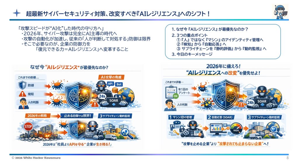 いま企業に求められているのは、被害をゼロにする理想論ではなく、「攻撃されても復元し、継続できる力」──すなわち AIレジリエンス への抜本的なシフトです。