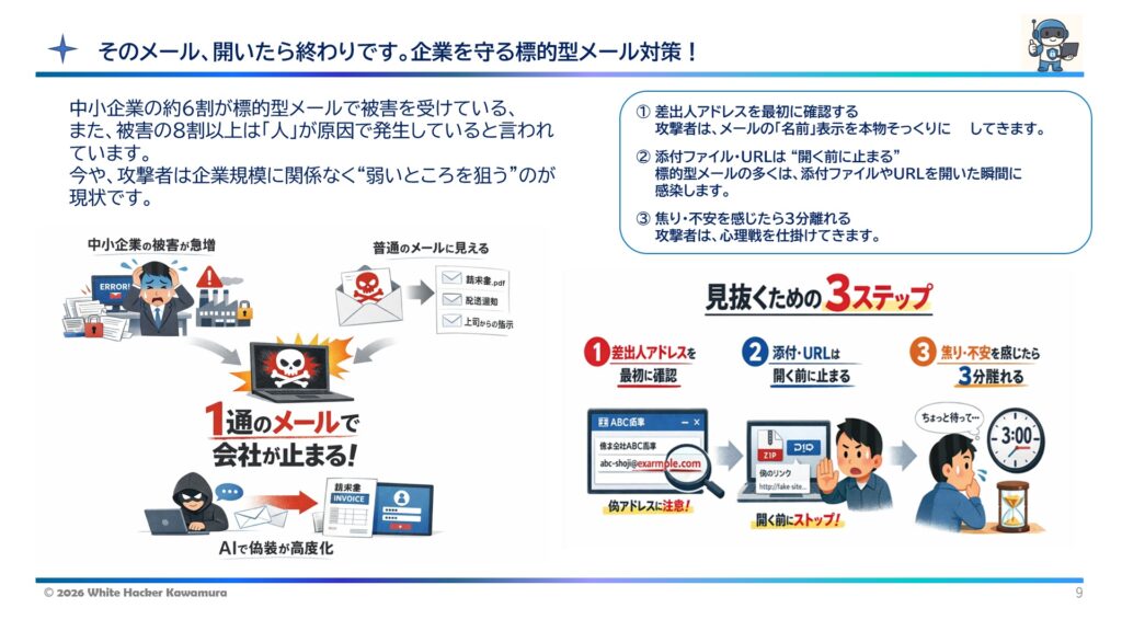 そこで今回、中小企業向けに「そのメール、開いたら終わりです。」をテーマとしたミニ講座を開催します。